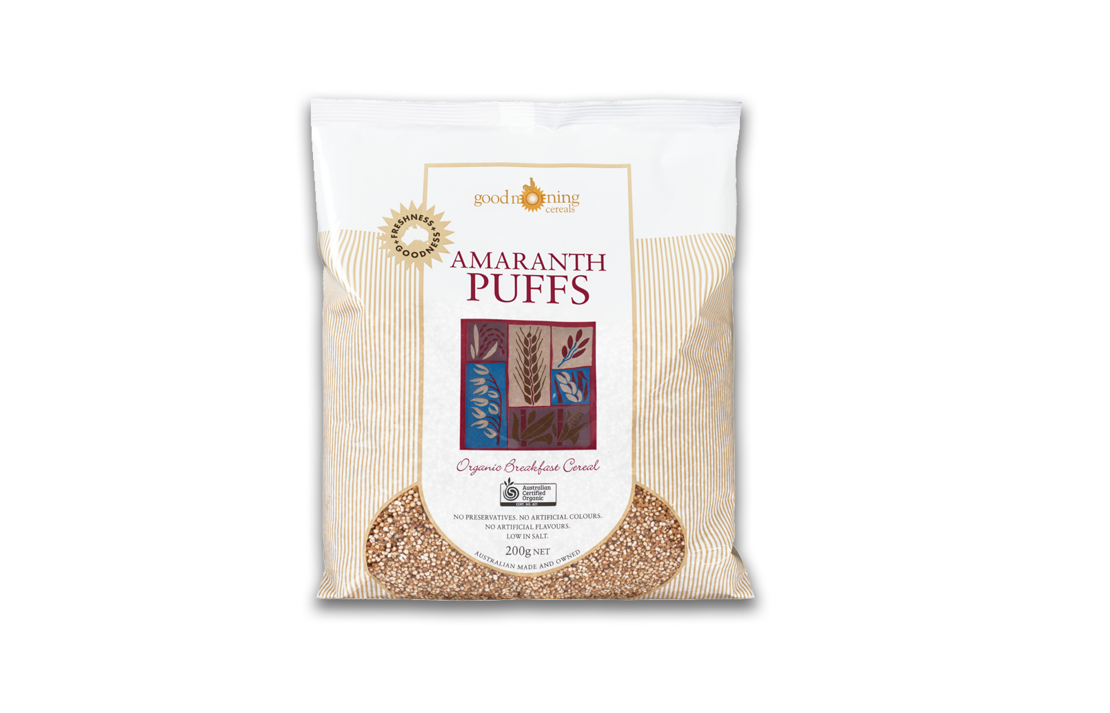 No preservatives. No artificial colours. No artificial flavours. Low in salt and fat. Made in Australia from imported grain from India.