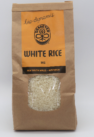 Australian grown certified Demeter biodynmaic White rice is brown rice that has first been milled to take away the bran and much of the germ. Its further polished to take away the remaining layer of germ (aleurone layer)