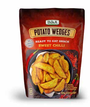 DJ&A Sweet Chilli Potato Wedges is a lightly salted and crispy snack prepared using a superior cooking process called vacuum cooking uses less oil and a lower temperature to preserve the natural potato goodness and delicious taste.