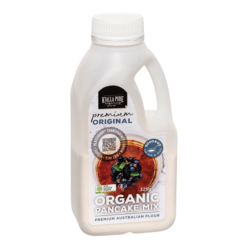 Our blend of Kialla Unbleached Plain Flour with other premium organic ingredients creates soft textured, sweet pancakes. Comes in a convenient shaker bottle with a large easy-pour spout and ergonomic handle so it is simple to make perfect fluffy pancakes every time.
